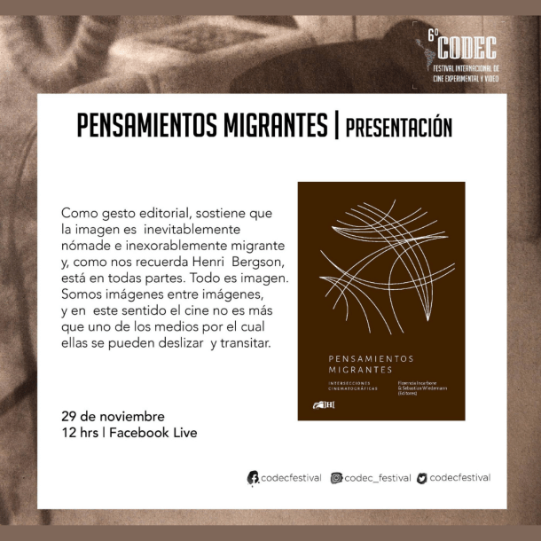 Pensamientos migrantes, como gesto editorial, sostiene que la imagen es inevitablemente nómade e inexorablemente migrante y, como nos recuerda Henri Bergson, está en todas partes. Todo es imagen. Somos imágenes entre imágenes, y en este sentido el cine no es más que uno de los medios por el cual ellas se pueden deslizar y transitar. Ellas, las imágenes, se hacen gesto de resistencia, pues al ser justo una imagen y no una imagen justa –como diría Jean-Luc Godard–, son dignas y nunca se dejan doblegar por un poder, un despotismo o una voluntad humana, demasiado humana, viciada en la idea de propiedad. Son pura potencia de resistencia, pues no son ni lujo, ni privilegio, y mucho menos posesión. Por el contrario, son la condición permeable y de pasaje para que lo viviente no se estacione o estanque. Desde luego que la imagen puede continuar transitando por la pantalla, pero, a su vez, ella hace de todo una pantalla, de todo una superficie por donde puede seguir. Sigue en los cuerpos, sigue en la escritura, sigue en estas páginas, así como en la política, el archivo, la memoria, la literatura y la filosofía. La imagen migra, y a su paso dispone y propone intersecciones, así como intervalos. Es decir, avanza por la vida afirmando lo viviente como gesto cinematográfico y, a su vez, excede y desborda el propio cine. O, si que quiere, donde el propio cine tiene que abrirse a metamorfosis, se hace gesto de montaje entre bloques de texto. Como editores hemos propuesto un montaje en tres tiempos, con dos intervalos (de inicio y cierre) como falsos cortes de un flujo imagético que ciertamente también podría exceder y migrar fuera del frágil contorno de este libro.